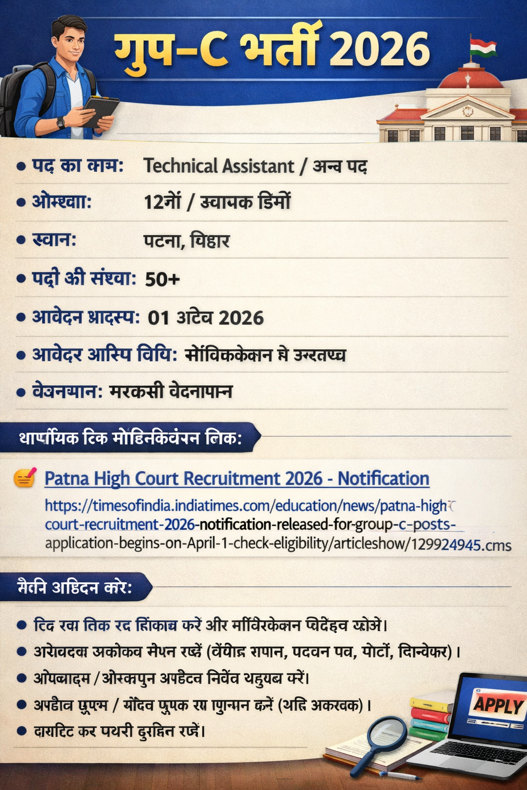📢 Patna High Court Group‑C Recruitment 2026 Job Details पद का नाम: Group‑C (Technical Assistant / अन्य पद) योग्यता: मान्यता प्राप्त बोर्ड/विश्वविद्यालय से 12वीं/स्नातक/प्रासंगिक डिग्री…